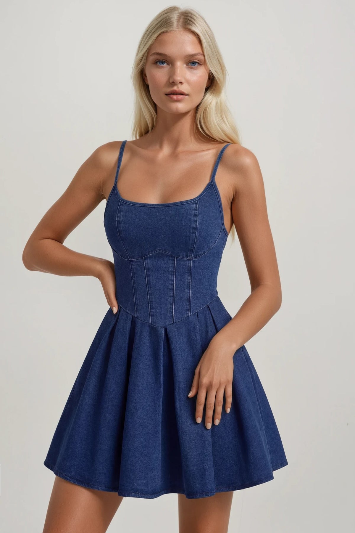 RIGID DENIM ALINE MINI DRESS WITH TIE DETAIL IN BACK W3213DIA