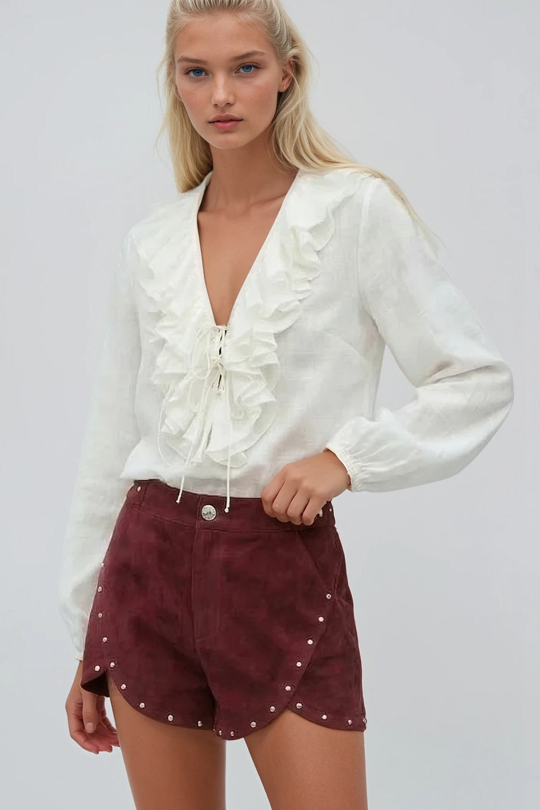 WHITE BALLOON SLEEVED TWILL WOVEN BUTTON DOWN BLOUSE 1594TIA